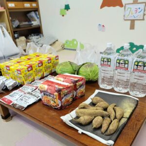 ラーメン・レトルトカレー・キャベツ・さつまいも・ビスケット・ミネラルウォーター ・ホッカイロ